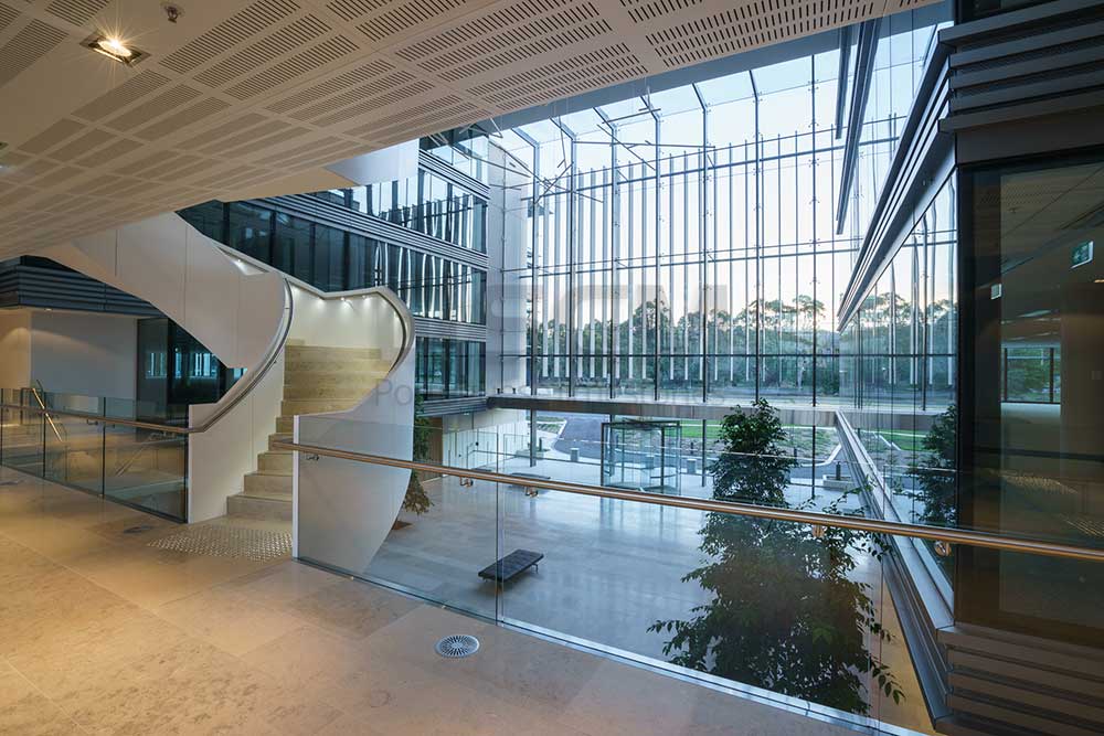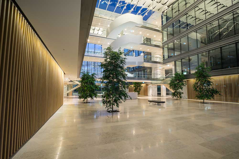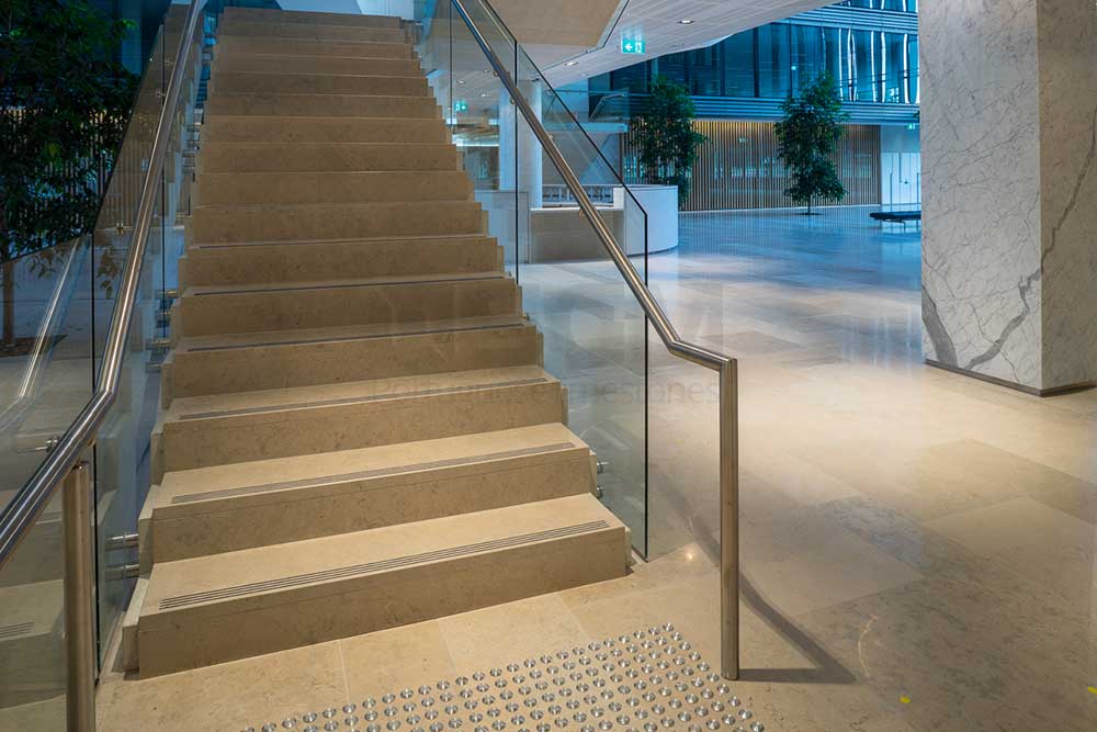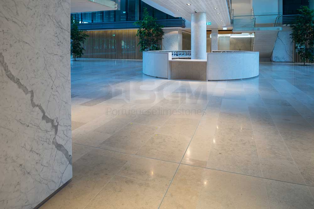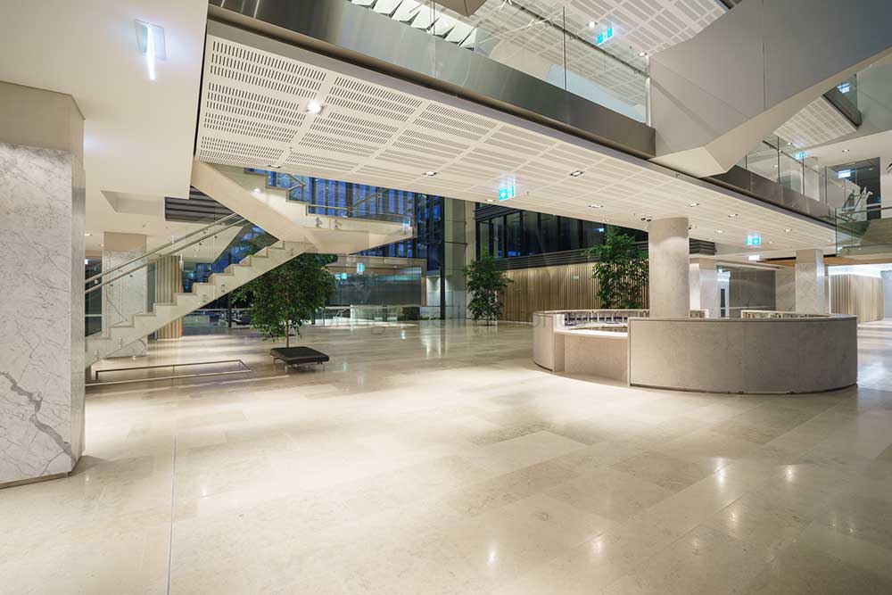 Supply of 4.000m2 of Moleanos Blue limestone tiles for the interior flooring application of this high-standard commercial building in the capital city of Australia, Canberra. The tiles were polished and with a high selection. The project also involved the supply of a rounded and massif reception desk, which is displayed at the center of the building.