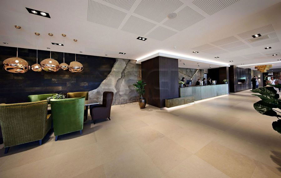 Supply of Moleanos Beige limestone tiles with large format for the Van der Valk hotel in Oostzaan, The Netherlands. The area covered was the main lobby and some ground floor areas with more visibility.
